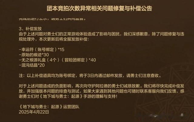 近期的第一波补偿时,我还不明觉厉!因为公告只是说团本竞拍次数异常进行修复。具体是啥问题只是一笔带过,这也让大部分玩家不清楚到底发生了什么事。当时只是看了一下补偿奖励,幸运符十五个,原始的痕迹三十个,无之根源一百六十个,混沌结晶二十个。对于新建角色的我来说,可以瞬间做出一把奥兹玛武器!当时只有喜悦,并没有多想!